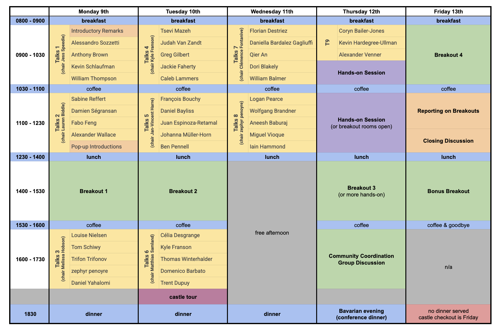 While there is no registration fee for the workshop, participants are responsible for their room and board at the castle. Due to the nature and style of the workshop, participants are expected to attend for the full week. The cost will be ~€850, which will include lodging and all meals and coffee breaks, as well as a workshop dinner on Thursday 12th March. Breakfast, lunch, dinner and coffee are provided on-site.